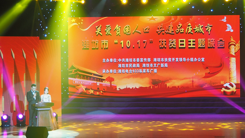扶贫济困是中华民族的传统美德,扶贫脱贫是全党全社会的共同责任。今年10月17日是第4个“全国扶贫日”,也是第25个“国际消除贫困日”。为推动全市脱贫攻坚工作胜利完成,10月17日,潍坊市“关爱贫困人口·共建品质城市”主题晚会在市工人文化宫举办。
