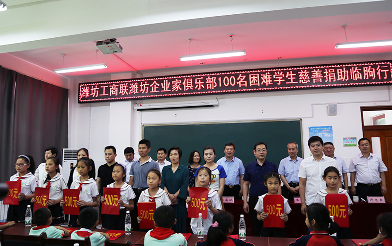 6月8日,潍坊市工商联、潍坊东方企业家俱乐部及社会各界爱心人士在临朐县龙山高新技术产业园龙岗小学举行捐资助学活动。