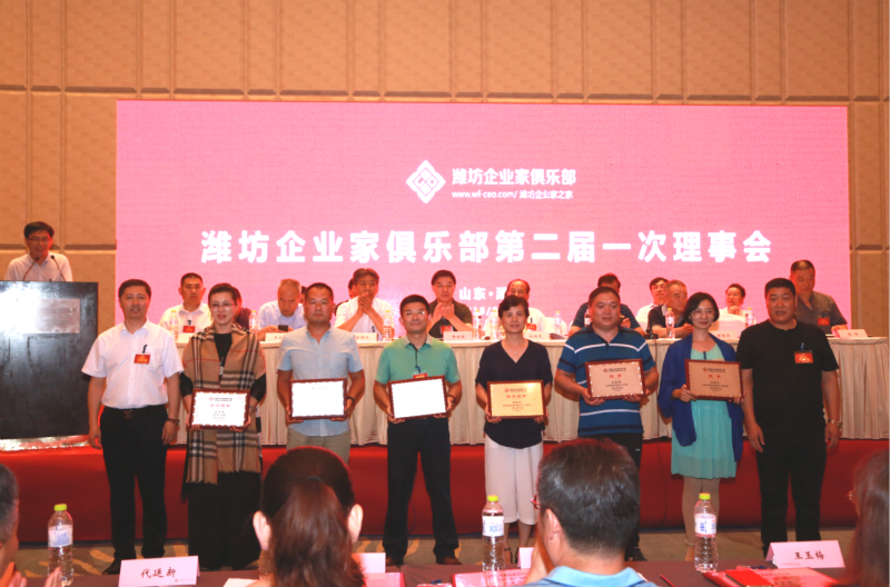 根据会议议程,以举手表决投票的方式选举产生潍坊东方企业家俱乐部第二届理事、常务理事、副秘书长、副会长、副监事长、监事长、常务会长、会长。大会选举王大威为潍坊东方企业家俱乐部第二届会长,选举山东乐化铝塑制品有限公司总经理孙建文为潍坊东方企业家俱乐部第二届监事长。聘请潍坊恒信建设集团董事长张玉强,中国联合网络通信有限公司潍坊分公司总经理张志辉,潍坊新华总部经济投资有限公司董事长李志清,寿光顺和船务有限公司董事长张伟为荣誉会长,并为他们颁发荣誉会长牌匾。