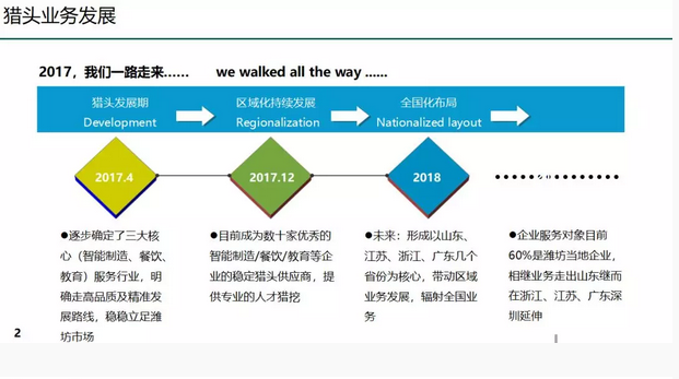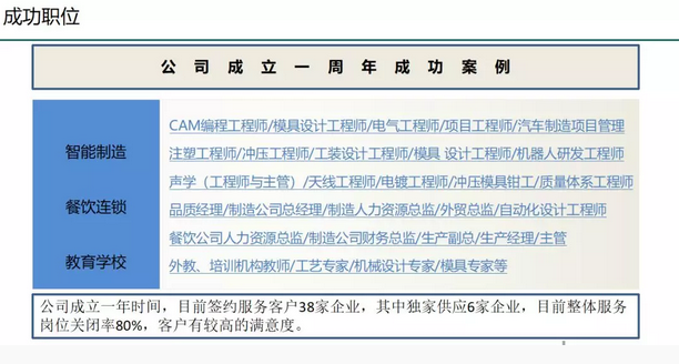1、目前成为数十家优秀的智能制造(软件)/餐饮/互联网等企业的稳定猎头供应商,提供专业的人才猎挖;