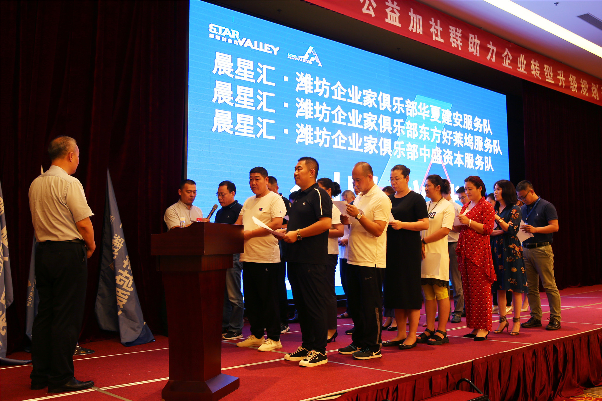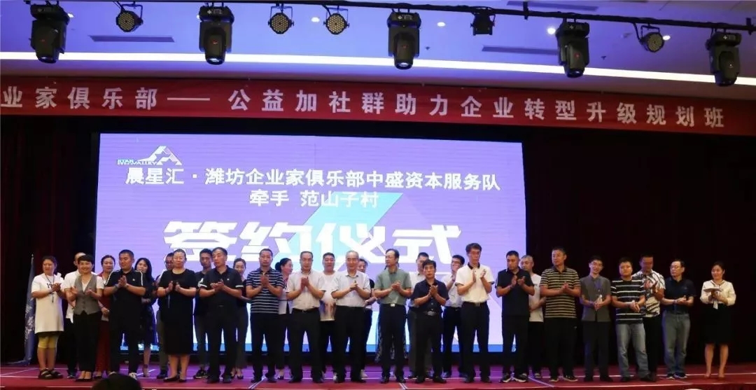 为促进公益模式有效落地,落实乡村振兴计划,会上举行了庄严的乡村振兴创队仪式。经潍坊市委统战部、潍坊市财政局、潍坊市住建局推荐,由潍坊东方企业家俱乐部常务会长单位潍坊东方好莱坞国际娱乐连锁机构董事长王超、潍坊中盛资本民间管理有限公司董事长张光文、潍坊市华夏建安有限公司总经理刘春海共同认领了乡村振兴服务队大队长,分别成立了晨星汇潍坊东方企业家俱乐部东方好莱坞服务队、晨星汇潍坊东方企业家俱乐部中盛资本服务队、晨星汇潍坊东方企业家俱乐部华夏建安服务队。