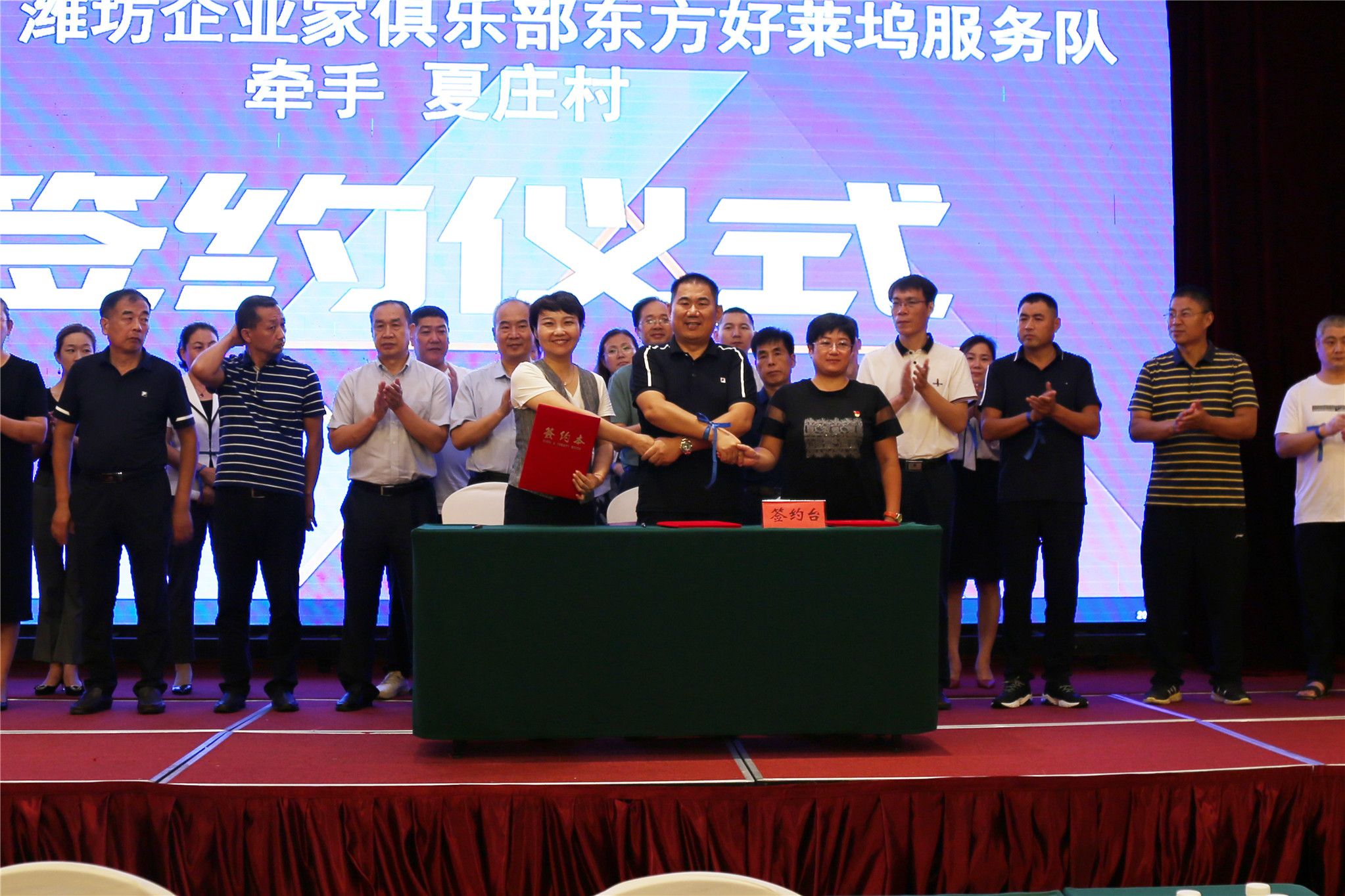 (晨星汇时燕老师与潍坊市政协委员、潍坊东方企业家俱乐部常务会长、东方好莱坞娱乐连锁机构董事长王超和夏庄村村支部书记丘丽娜女士签约)