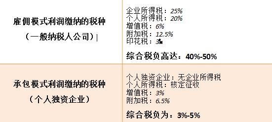 税佳宝为企业做税务筹划,首先保证企业业务真实性的前提下,再为企业构建节税思维,了解缴税逻辑:交易产生税,什么样交易模式产生什么样的税!所以我们通过改变交易模式:将传统的雇佣关系的经营模式转变为承包经营的模式!通过设立个人独资企业与公司形成合作关系,活还是一样的干,但是我们可以享受个人独资企业优惠的税收政策,使缴纳的税负一下节省了80%以上。(节税对比如下图)