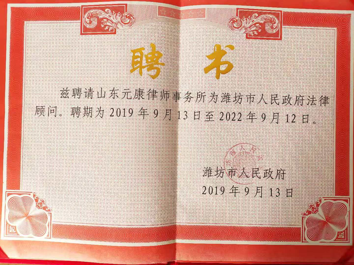 律所担任多家企事业单位和政府法律顾问,目前担任的法律顾问单位50多家。包括:潍坊市人民政府、潍坊市高新区管委会、潍坊市司法局、潍城区公路局、潍城区乐埠山管委会、山东相帅科技有限公司、中国人民财产保险股份有限公司潍坊中心支公司、山东路达重工机械有限公司、潍坊晨安物流有限公司……