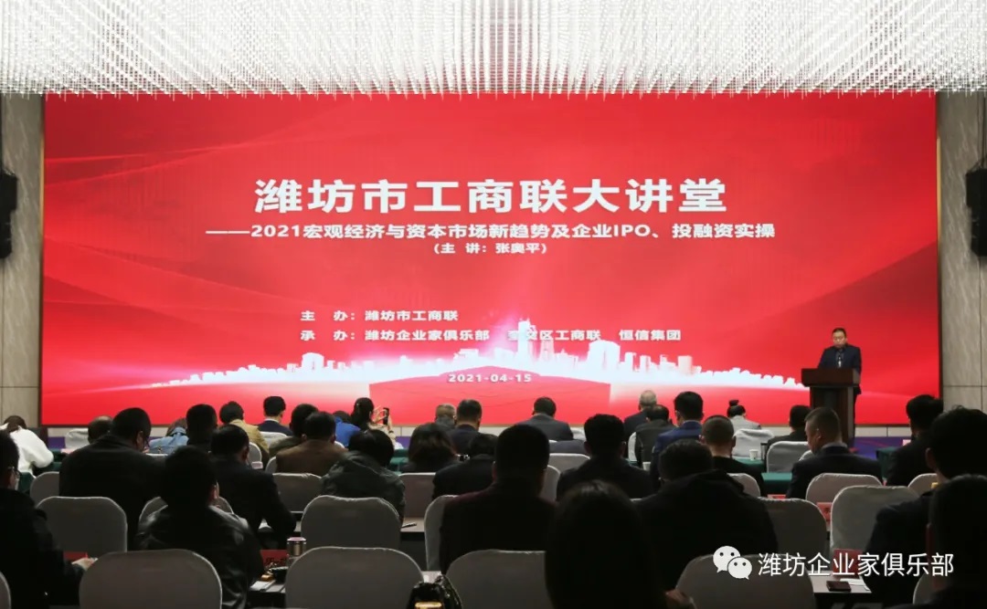 4月15日,由潍坊市工商联主办,潍坊东方企业家俱乐部、奎文区工商联、恒信集团承办的潍坊市工商联大讲堂——2021宏观经济与资本市场新趋势及企业IPO、投融资实操培训活动在恒信大厦成功举办。