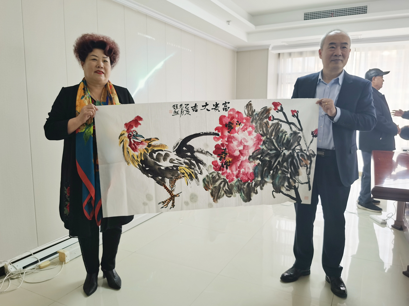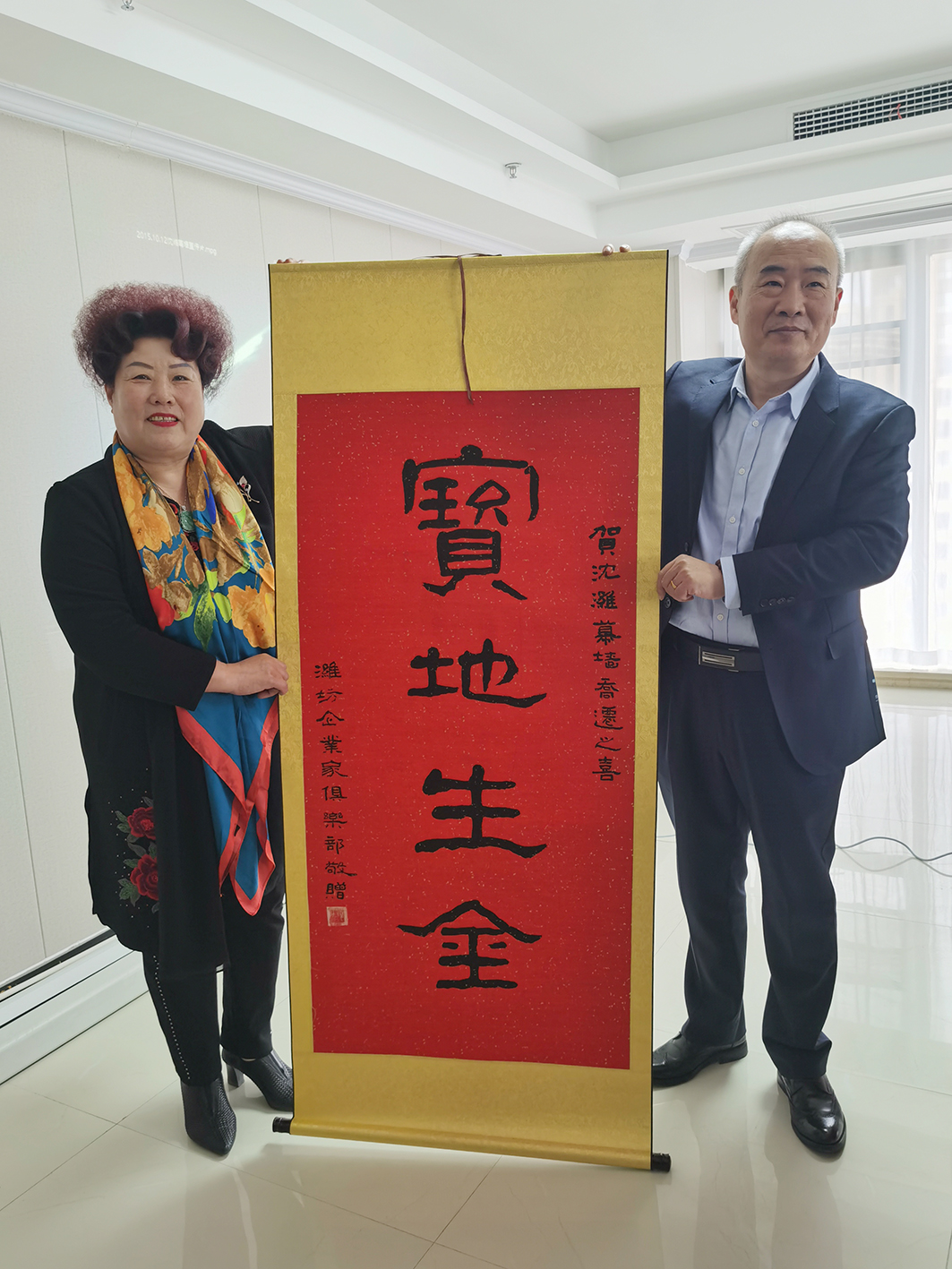 会长王大威代表潍坊东方企业家俱乐部为祝贺山东沈潍幕墙装饰工程有限公司乔迁之喜,赠送书画作品。祝愿山东沈潍幕墙装饰工程有限公司乔迁新址宝地生金,生意蒸蒸日上!