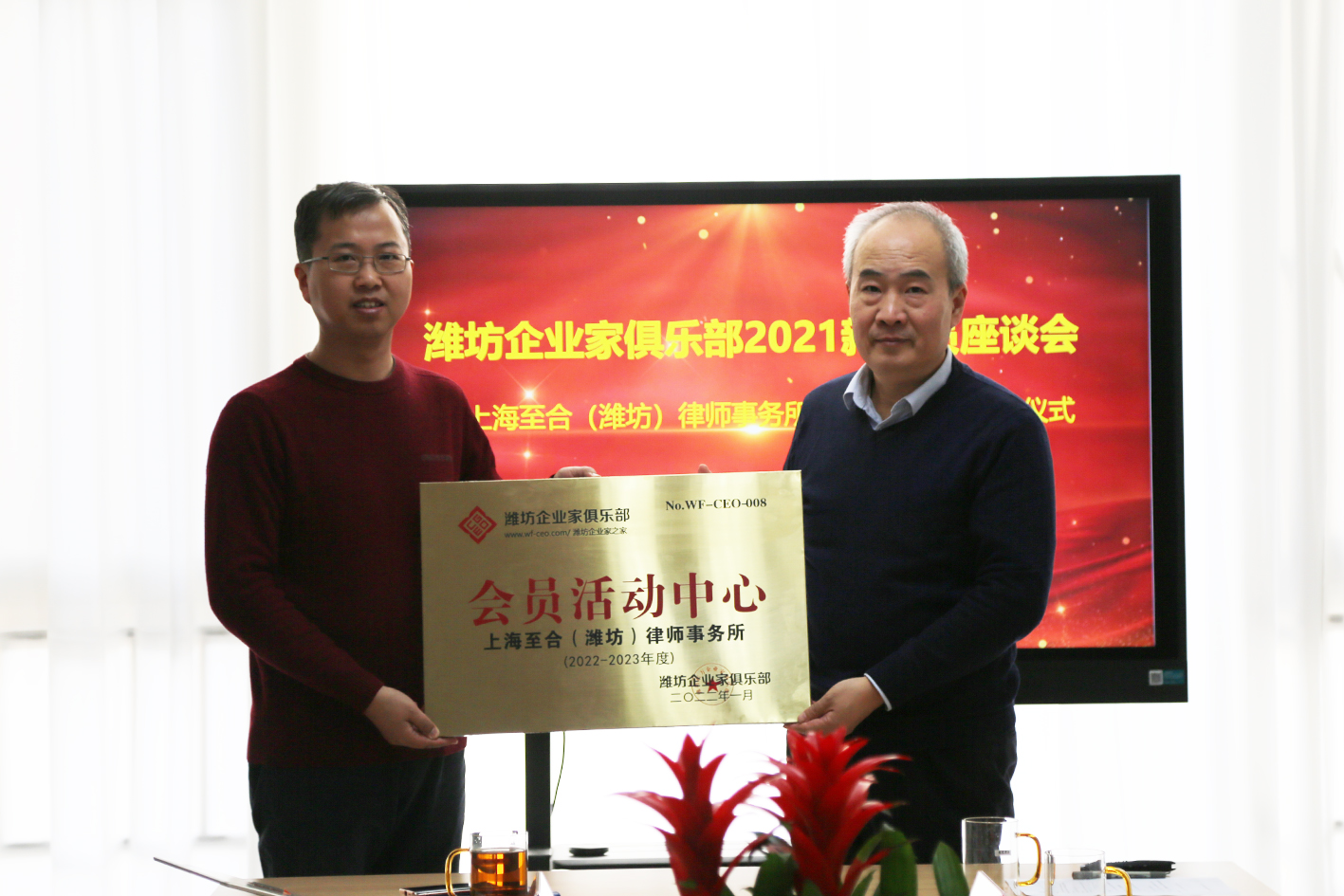 12月28日,潍坊东方企业家俱乐部2021新会员座谈会暨潍坊东方企业家俱乐部上海至合(潍坊)律所活动中心成立授牌仪式在上海至合(潍坊)律师事务所成功举办。