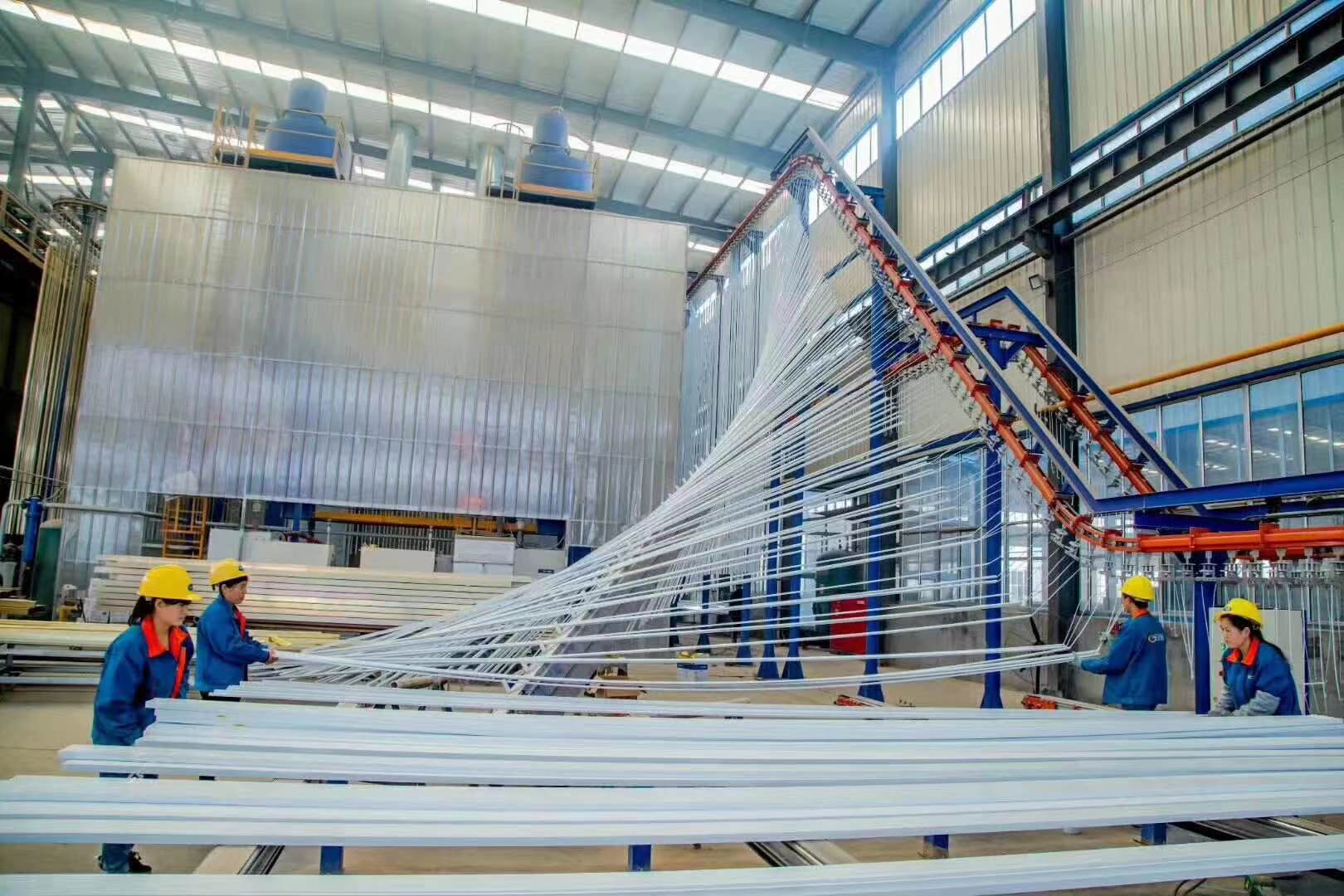 本公司是生产门窗铝材的规范化企业,具有完备的研发生产、制作安装体系。具有挤压、氧化、电解着色、电泳、喷涂、木纹转印和隔热型材等完整的生产体系。公司下设:挤压车间、氧化车间、电泳车间、 粉末喷涂车间、氟碳喷涂车间、注胶式隔热车间、穿条式隔热车间、门窗幕墙制作车间、工业型材及建筑型材深加工车间,是一家集型材生产、深加工及门窗制作、安装为一体的综合性的企业。