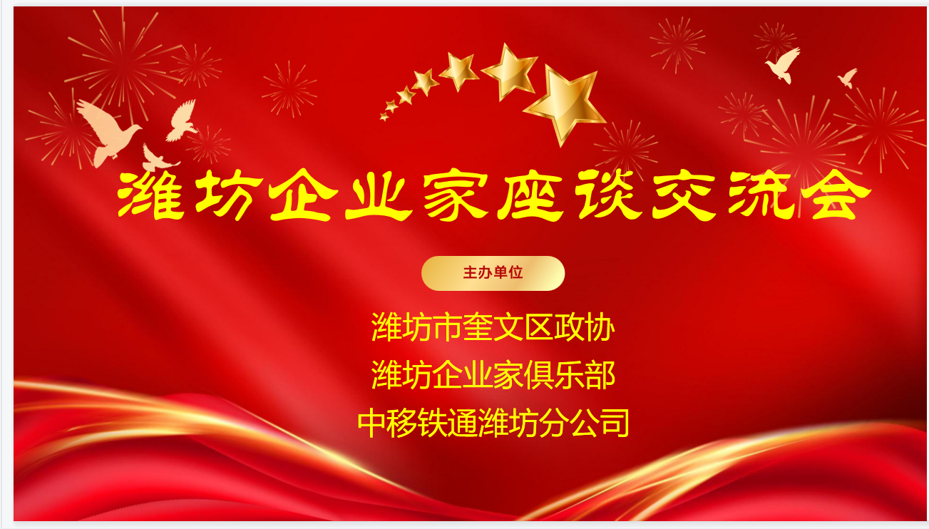 3月21日,由潍坊市奎文区政协、潍坊东方企业家俱乐部、中移铁通有限公司联合主办的潍坊企业家座谈交流会在潍坊东方企业家俱乐部理事单位——中移铁通有限公司潍坊分公司举行。
