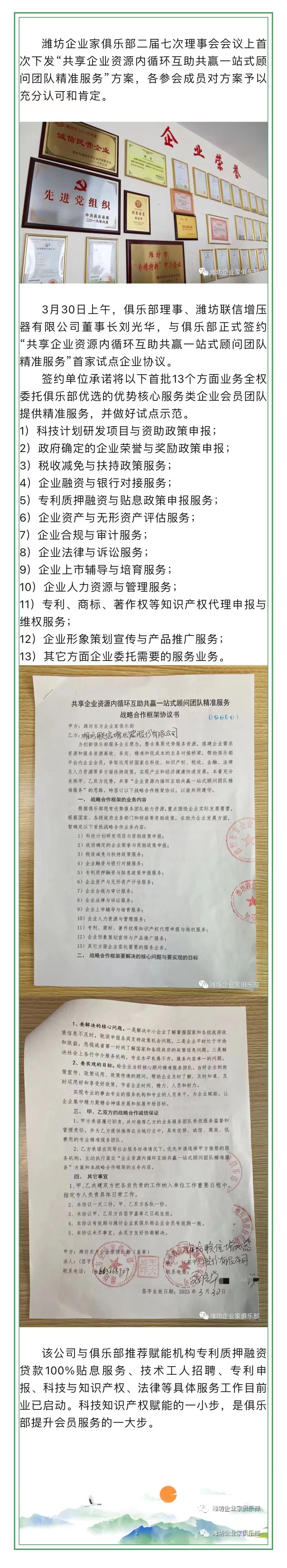 潍坊东方企业家俱乐部“共享企业资源内循环互助共赢一站式顾问团队精准服务”首家试点企业正式签约