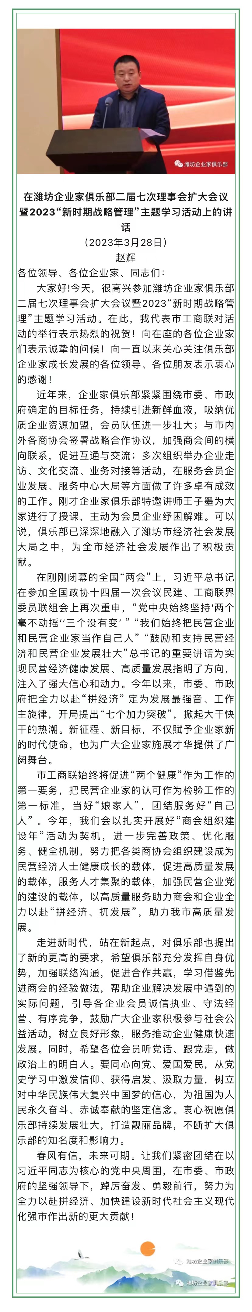 潍坊市工商联党组成员、副主席赵辉在潍坊东方企业家俱乐部二届七次理事会上的讲话