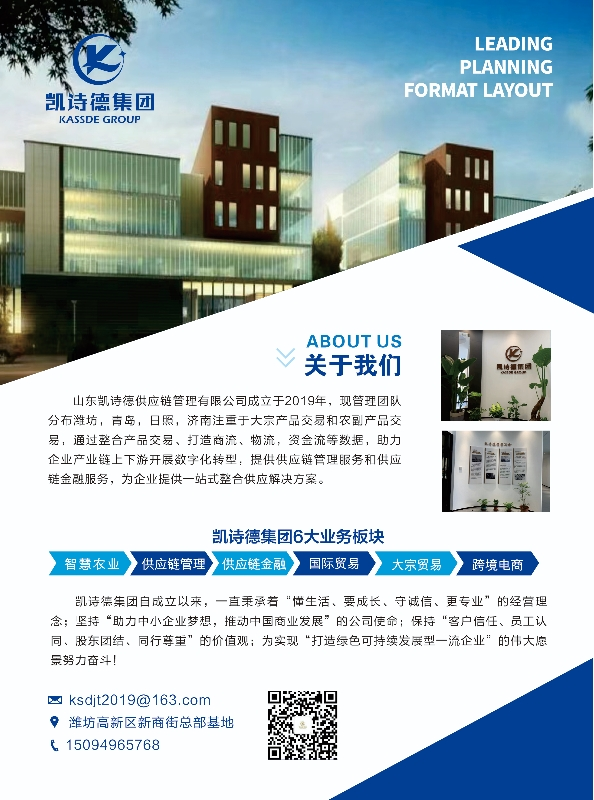 山东凯诗德供应链管理有限公司,成立于2019年,现管理团队分布潍坊,青岛,日照,济南,注重于大宗产品交易和农副产品交易,通过整合产品交易、打造商流、物流,资金流等数据,助力企业产业链上下游开展数字化转型,提供供应链管理服务和供应链金融服务,为企业提供一站式整合供应解决方案。