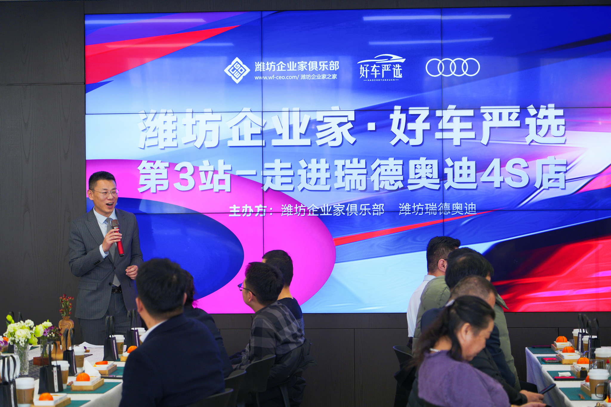 潍坊东方企业家俱乐部理事、潍坊瑞德汽车销售服务有限公司总经理封磊在欢迎词中说道,欢迎潍坊东方企业家俱乐部的各位同仁来到瑞德奥迪4s店,并向大家简介瑞德奥迪的企业资历与特色服务。作为新加入的潍坊东方企业家俱乐部成员,会将自己的资源优势融入平台,共同为平台的成长助力。希望大家今天交流尽兴,选到自己的心爱座驾。