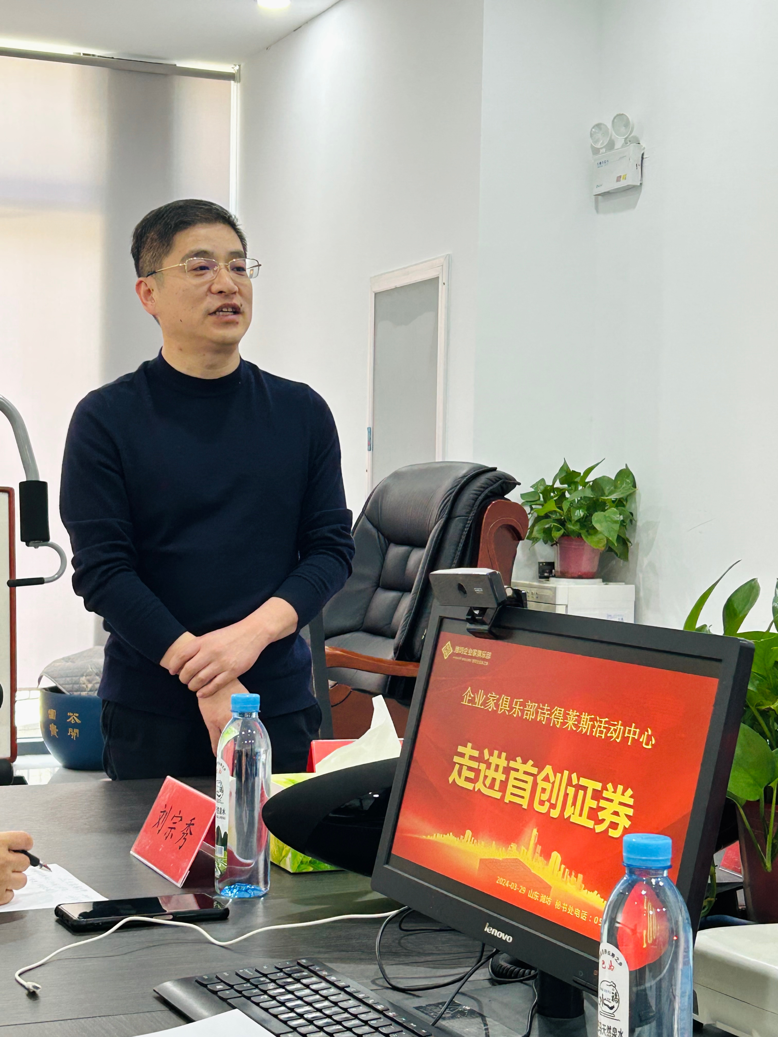 首创证券潍坊虞河路营业部总经理孟庆波对于潍坊东方企业家俱乐部诗得莱斯活动中心一行的到来表示热烈欢迎。他表示朋友们的真情与事业的专业度是最不能辜负的人生珍宝,希望大家来到首创证券可以交流舒心,有所收获。