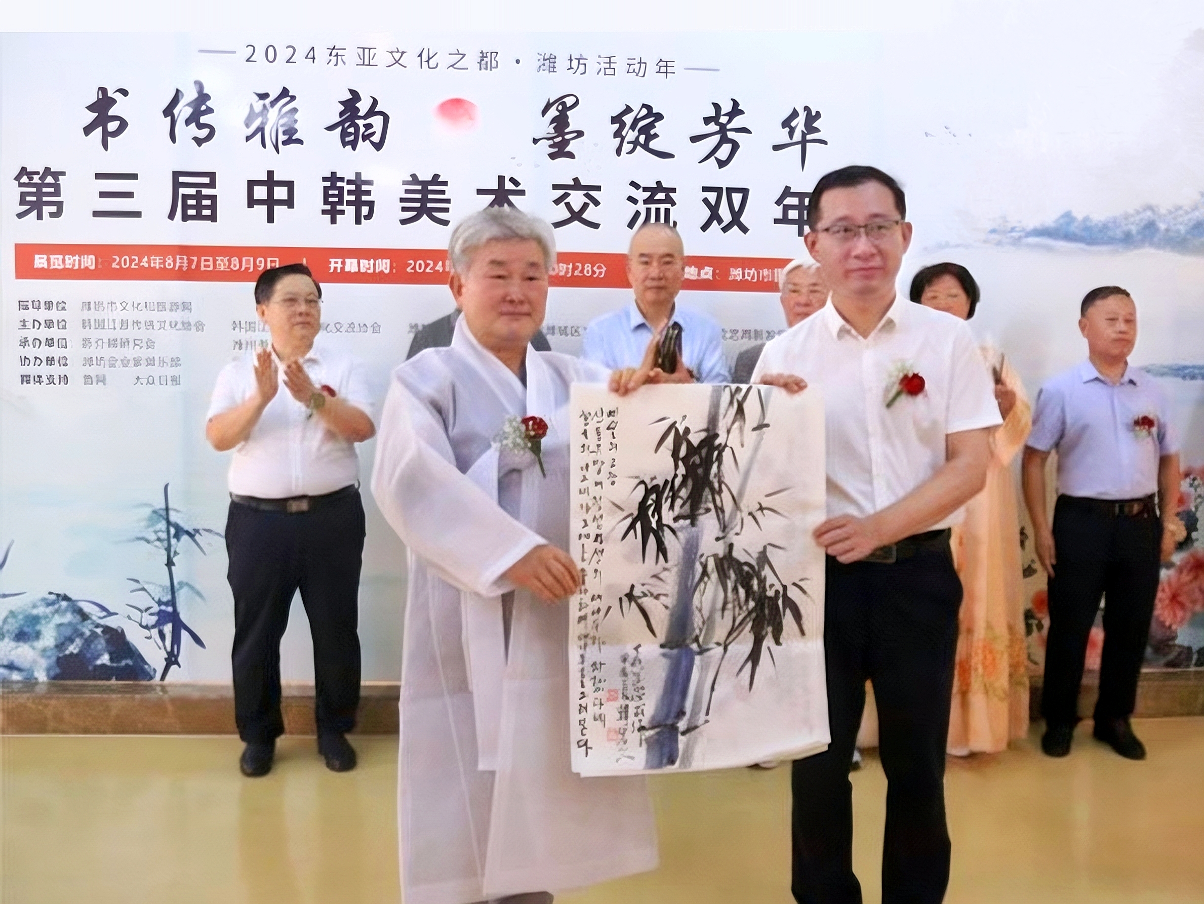 这次双年展由潍坊市文化和旅游局指导,韩国江原传统文化协会、韩国江原桂中立化本法协会、潍坊市图书馆等主办,陈介祺研究会、潍州书画院承办,潍坊东方企业家俱乐部等协办。