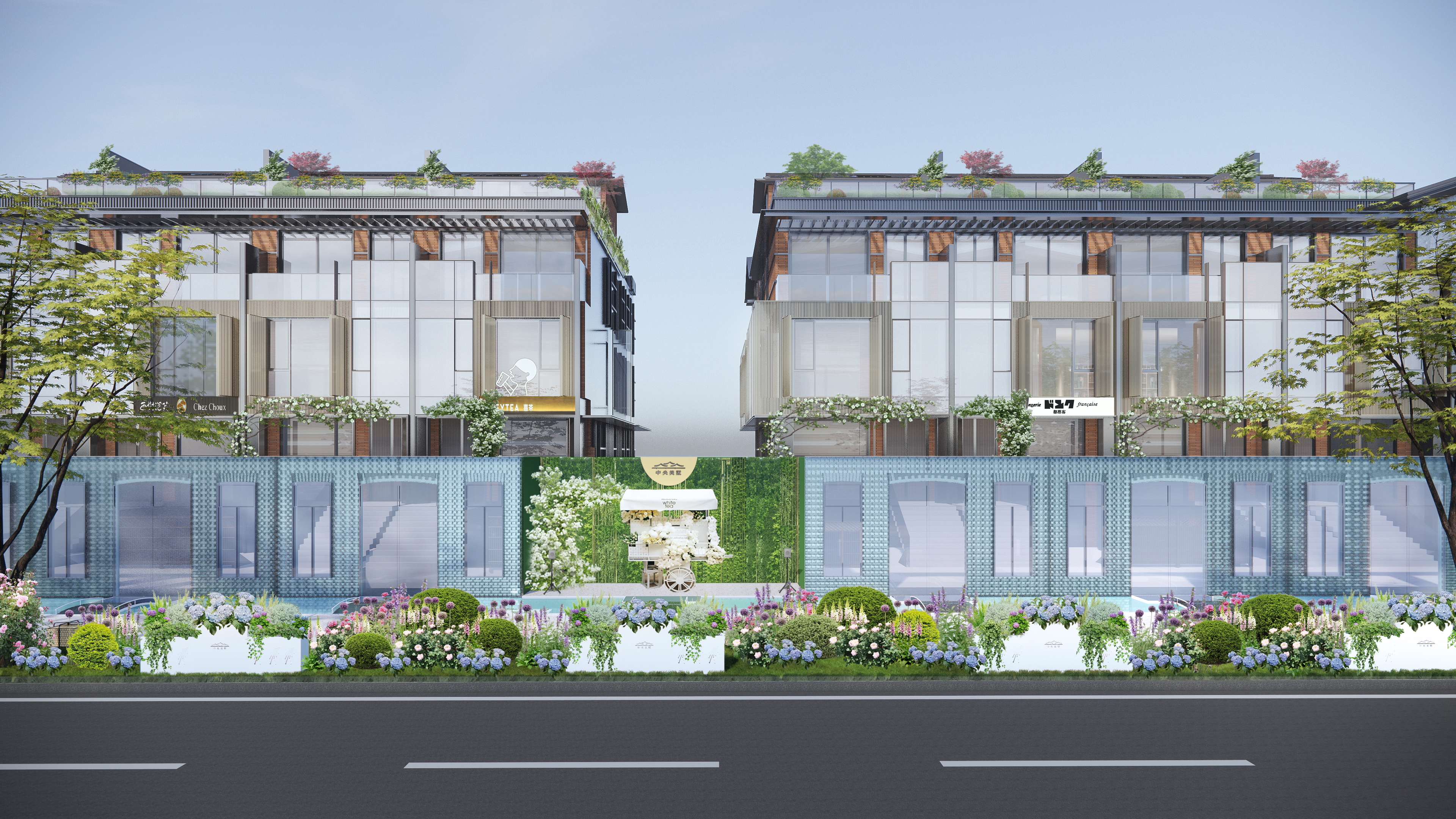 中央美墅沿街的水晶琉璃院墙花街已申报世界吉尼斯纪录,总长度400余米,高度3.2米。人行路面全面升级为水洗石路面,每一步都感受着大自然的温柔。花境采用时令鲜花,四季长青。当夜幕降临,花街的夜景灯光如星辰般璀璨,照亮了回家的路。
