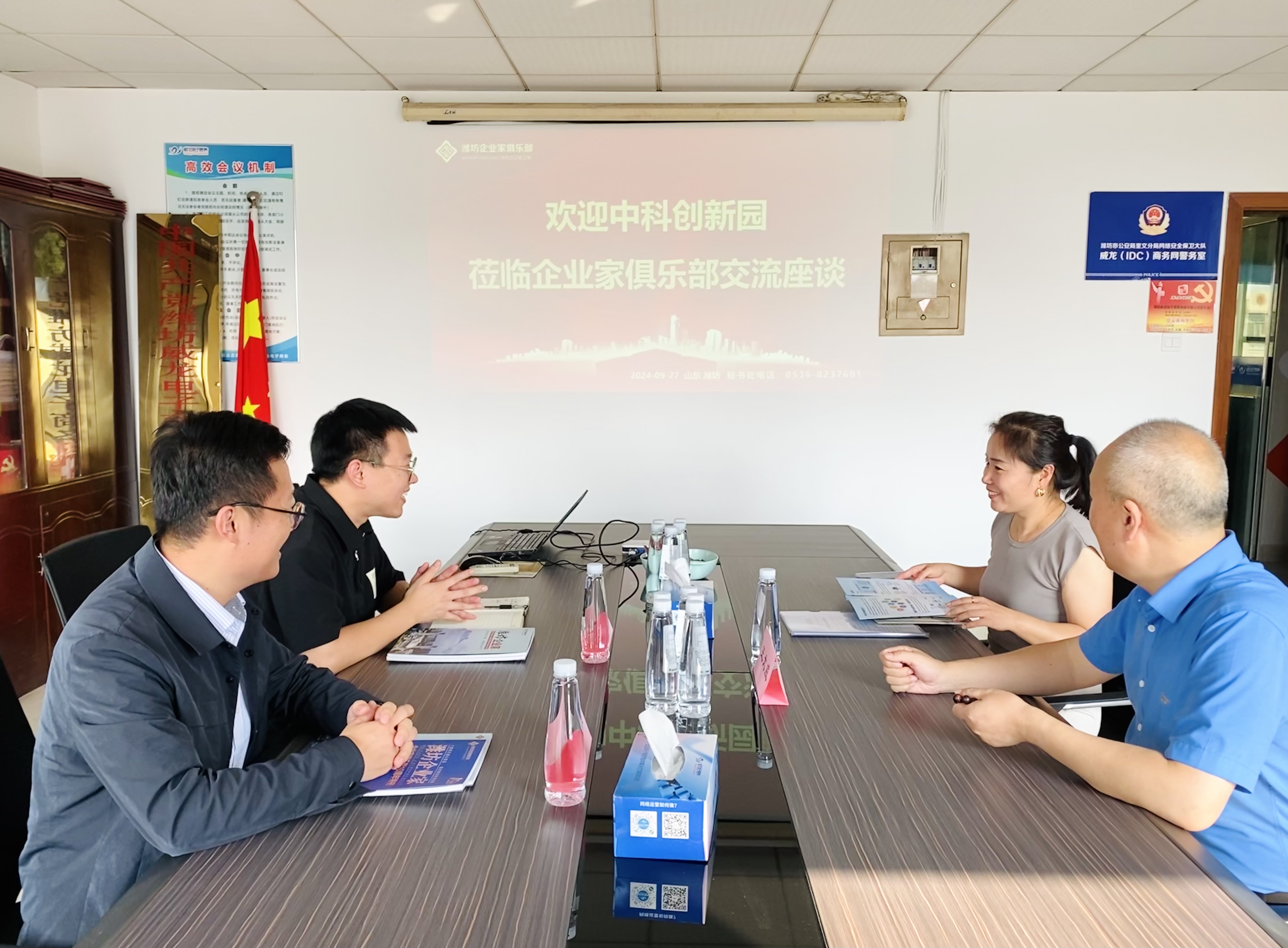 9月27日,中科创新园总经理助理陈广源,服务经理朱洋行一行至潍坊东方企业家俱乐部进行座谈交流。潍坊东方企业家俱乐部理事长王大威,副秘书长、潍坊威龙电子商务科技有限公司总经理王翠萍做热情接待。