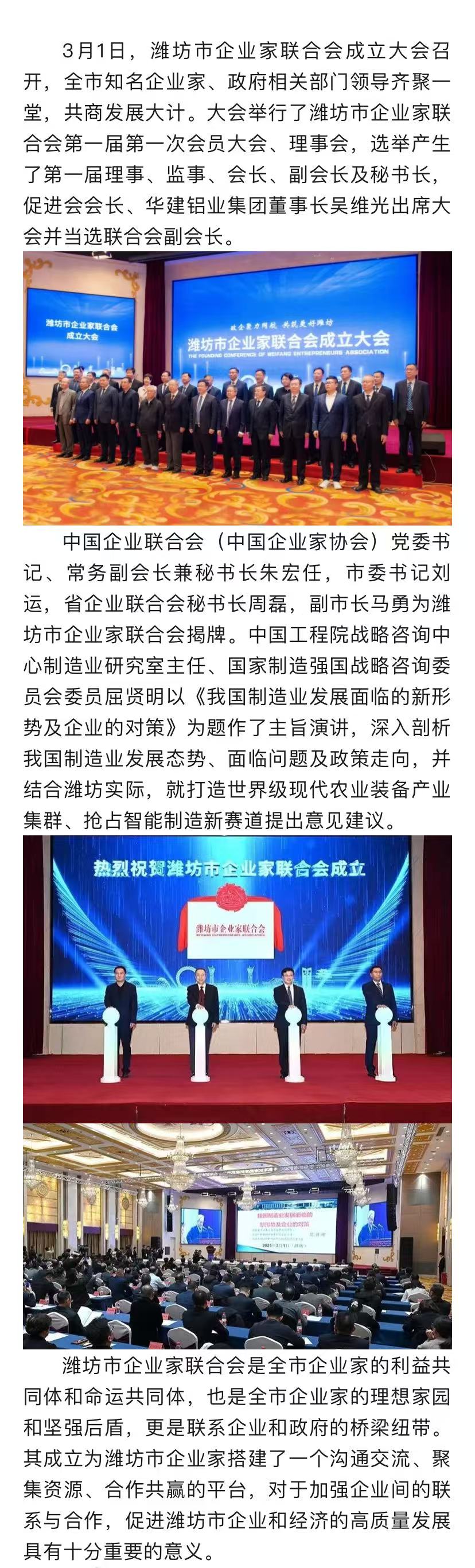 潍坊市企业家联合会成立,县促进会会长、华建铝业集团董事长吴维光当选副会长