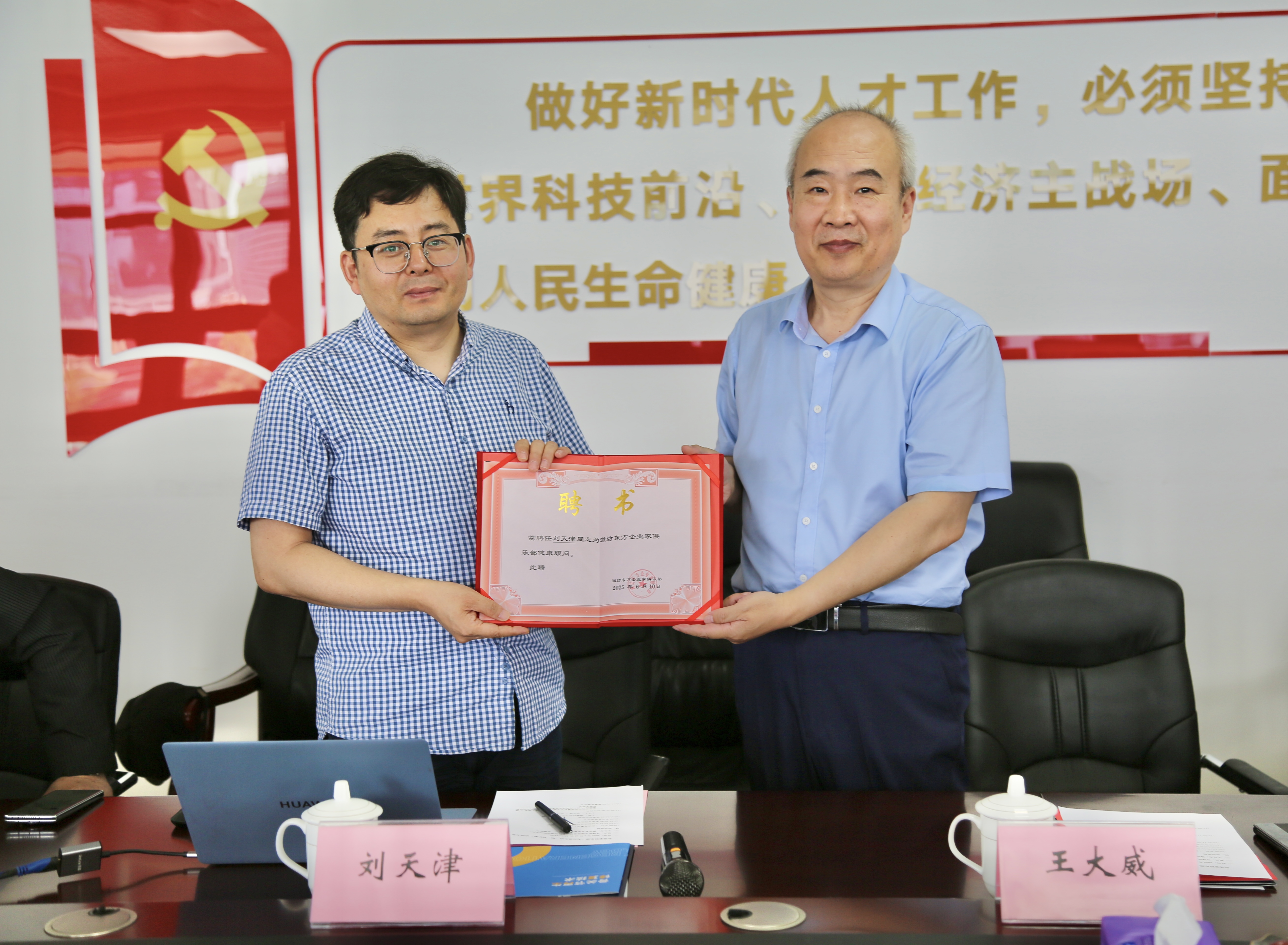 潍坊东方企业家俱乐部理事长王大威为刘天津博士颁发潍坊东方企业家俱乐部"健康顾问"聘书。