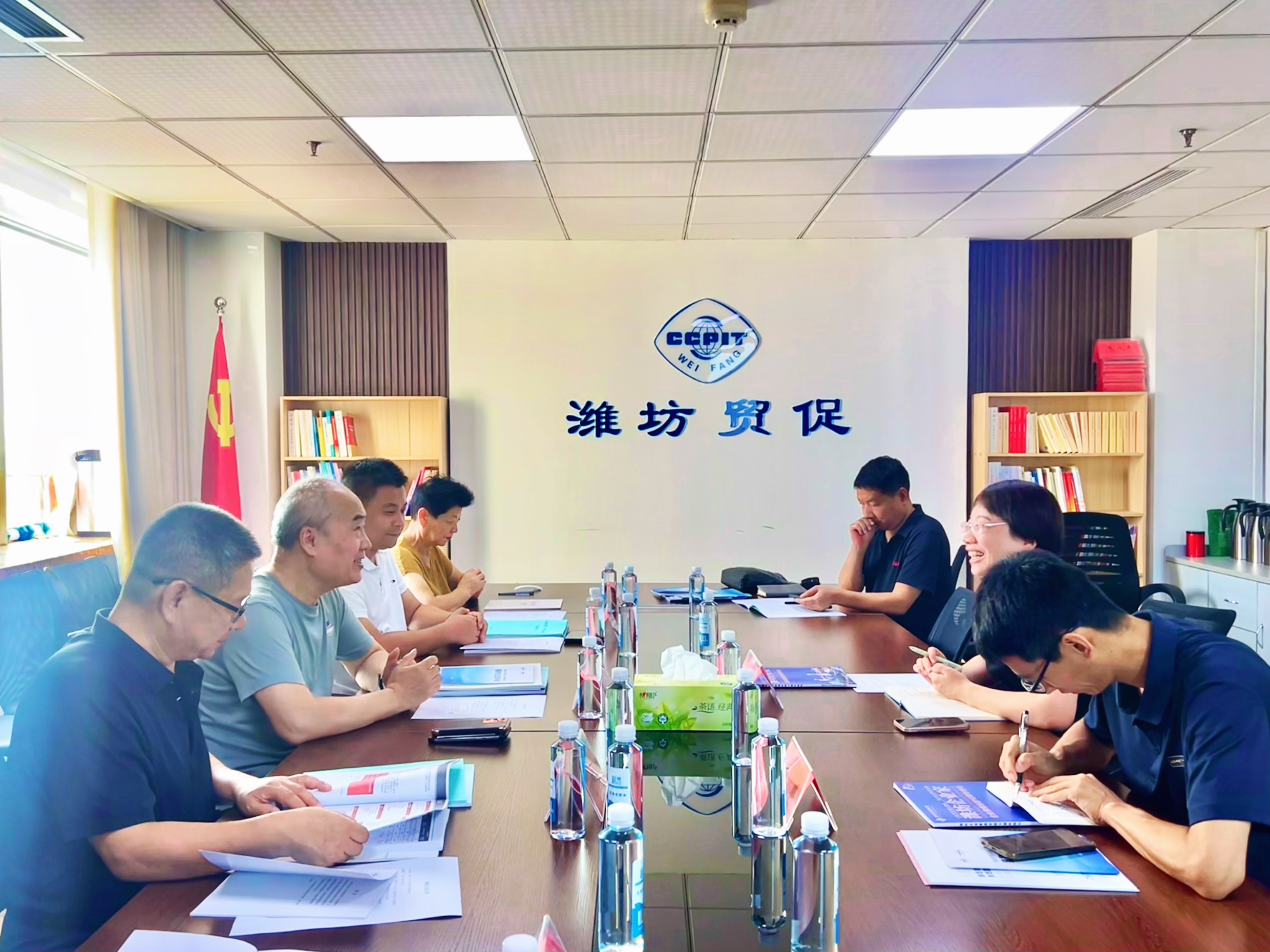 7月28日,潍坊东方企业家俱乐部走访潍坊市贸促会。潍坊东方企业家俱乐部理事长王大威,金石工程设计 (山东) 集团有限公司董事长杜鹏成,潍坊龙创科技服务有限公司总经理李树祥,山东鑫达鲁鑫防水材料有限公司总经理孙美峰,执行秘书长张帅帅等参与此次活动。