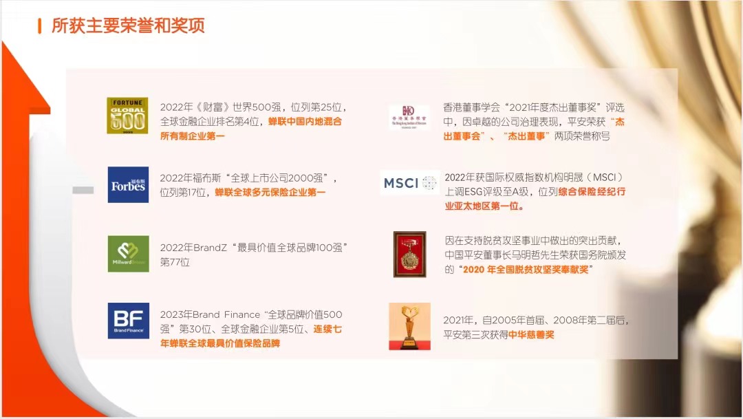 中国平安2022年《财富》世界500强,位列第25位,全球金融企业第4位,平安现在致力于大健康、大医疗板块,秉承专业的“金融顾问、家庭医生、养老管家”服务。把商业保险建成社会保障体系的重要支柱,构建多层次服务体系,可为客户提供寿险、理财、车险、贷款等业务。