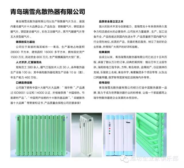 公司旗下拥有中国十大散热器大品牌:“瑞雪兆”。公司产品包含:钢制系列、铜铝复合系列、钢铝复合系列、蒸汽系列、卫浴系列等五大类型暖气片。