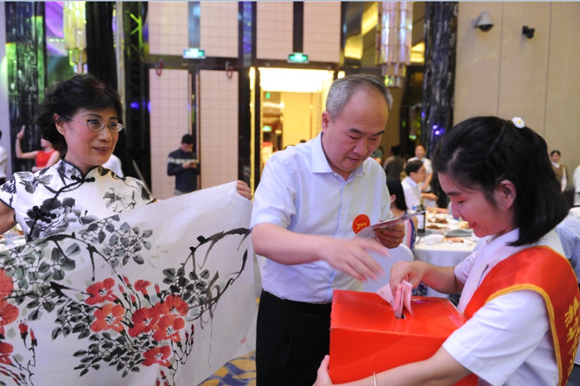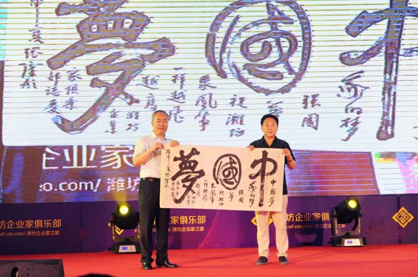 活动现场,全国青联常委、中国书法家协会会员、中国书协培训中心教授、中国政法法学书法客座教授、中日硬笔友协名誉主席张宝彤先生,潍坊东方企业家俱乐部顾问、潍坊渤海书画院院长辛炳申先生特意创作书画作品赠予潍坊东方企业家俱乐部。潍坊东方企业家俱乐部会长王大威先生上台接收赠予,并合影留念。