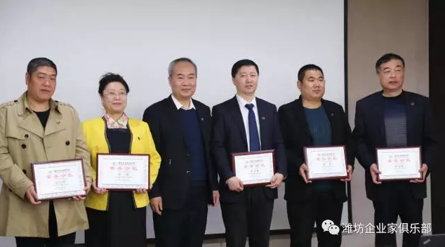 会上还为一届九次理事会批准通过的潍坊东方企业家俱乐部领导成员举行了集体授牌仪式。会长王大威为各常务会长颁发会牌,各常务会长为一届九次理事会上通过的12名理事领导颁发会牌。