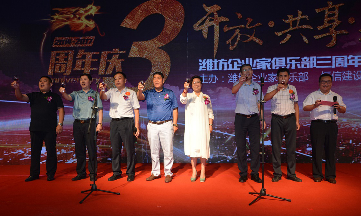 轮值会长兼常务会长王超带领各常务会长登台敬酒,祝愿祖国繁荣昌盛,祝愿各会员单位生意蒸蒸日上,祝愿我们的明天更加美好,祝潍坊东方企业家俱乐部三周年生日快乐!