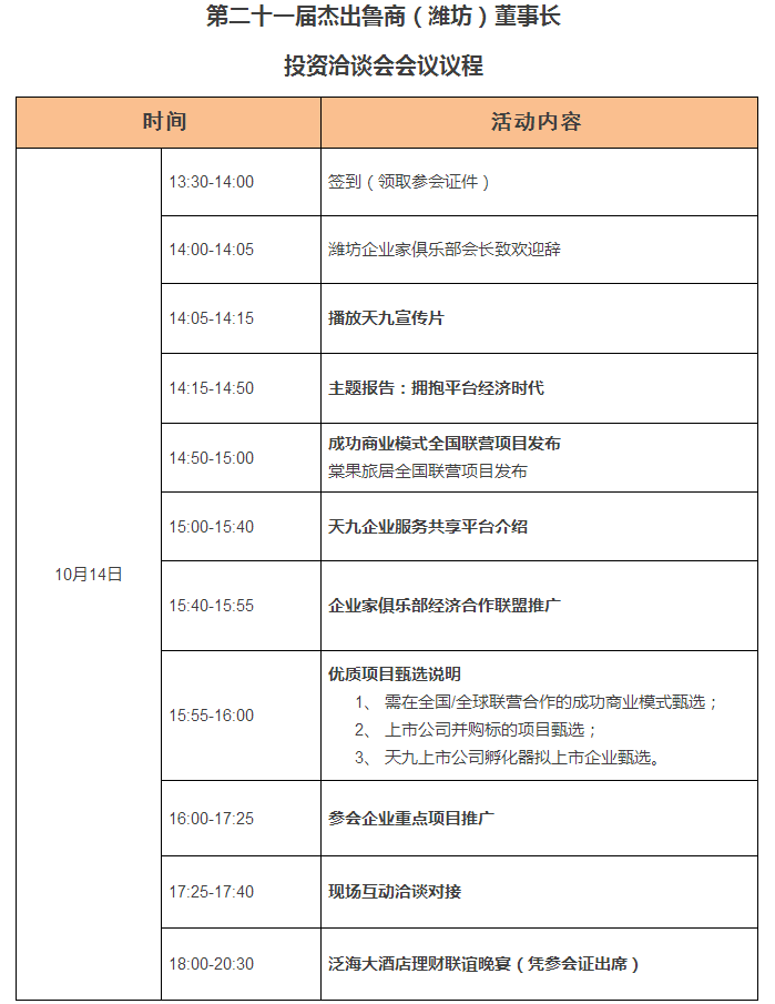 潍坊东方企业家俱乐部本着拓展业务、加强学习、促进杰出鲁商强强联手,抱团发展的原则,联合天九平台投资集团举办“杰出鲁商(潍坊)董事长投资洽谈会”,潍坊东方企业家俱乐部会员经推荐,可免费出席(非会员8800元/人次)。