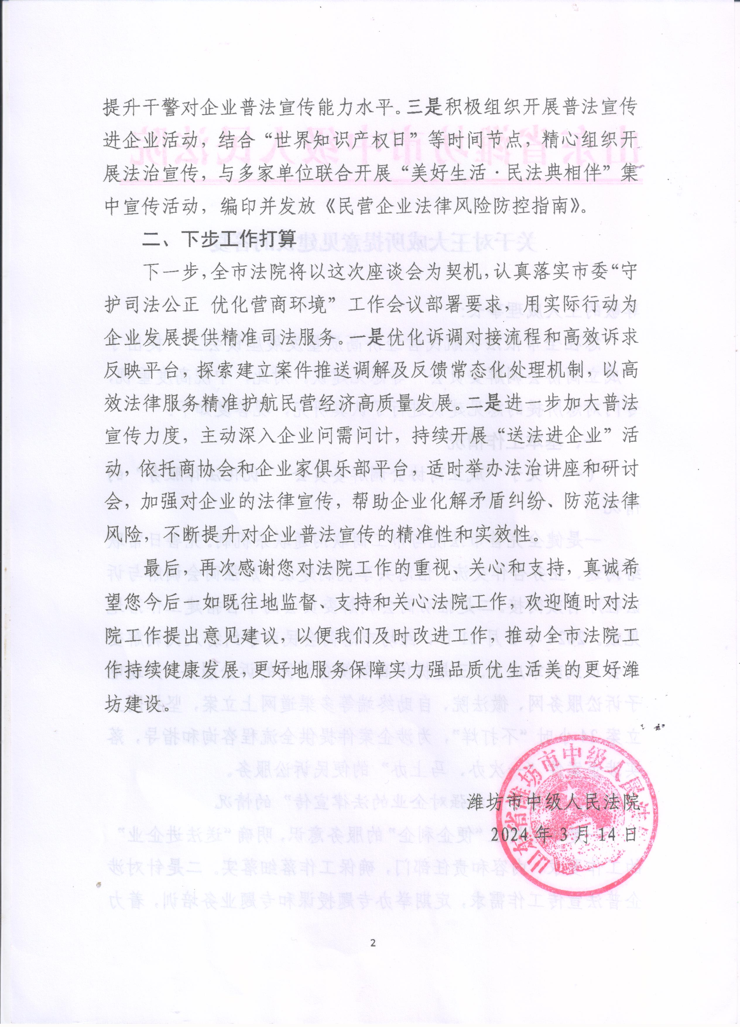 民营经济是市场经济的重要组成部分,是推动高质量发展的重要力量。市中级人民法院积极回应民营企业呼声,不仅体现了对民营经济的重视和支持,更彰显了其作为司法机关的担当和使命。相信在市中级人民法院的持续努力下,潍坊市的法治化营商环境必将得到进一步优化,民营经济也将迎来更加广阔的发展空间。