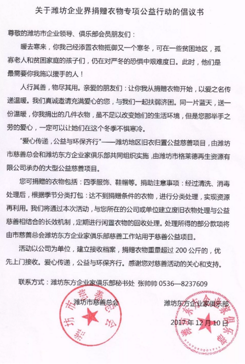 关于潍坊企业界捐赠衣物专项公益行动的倡议书