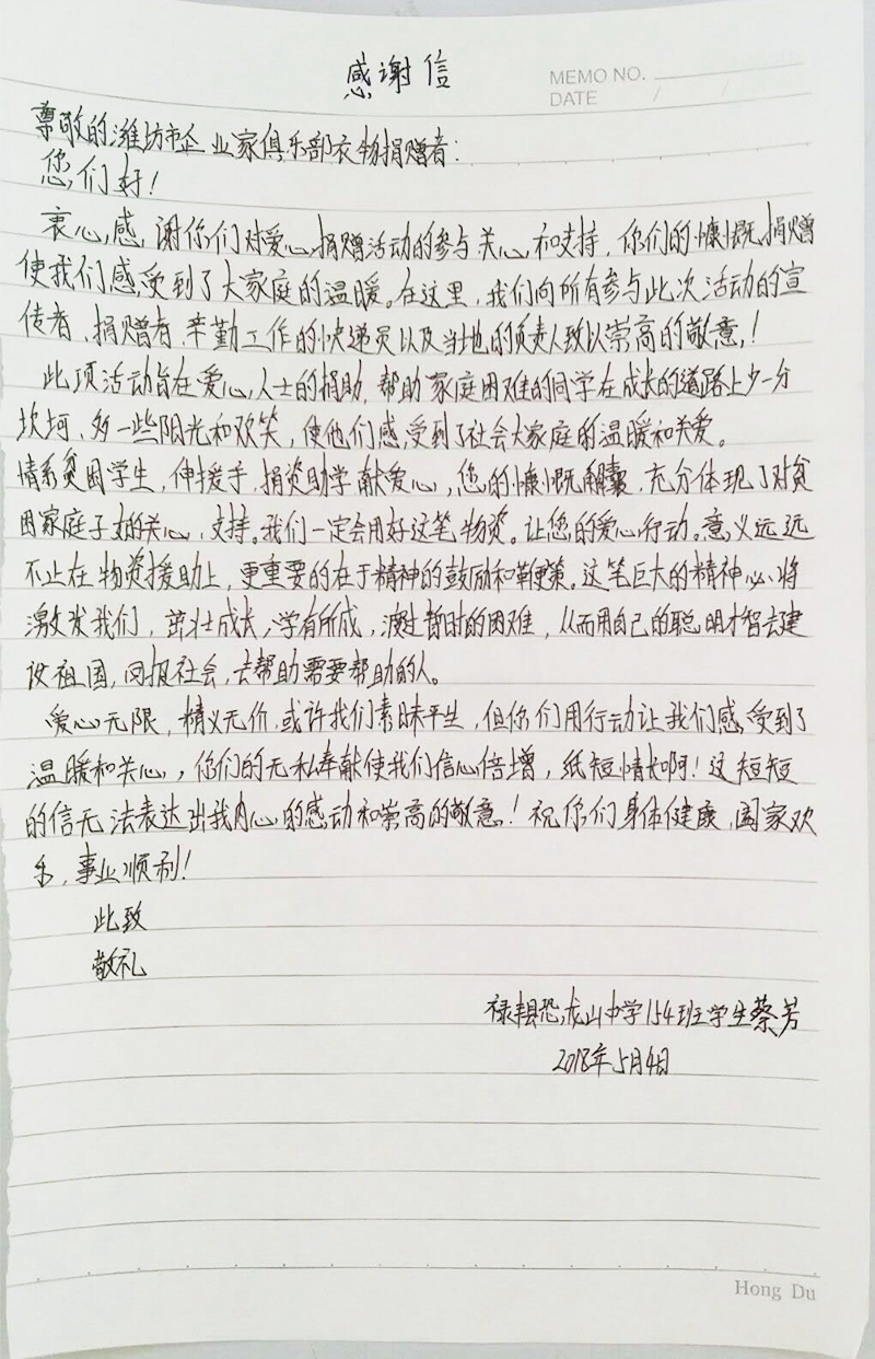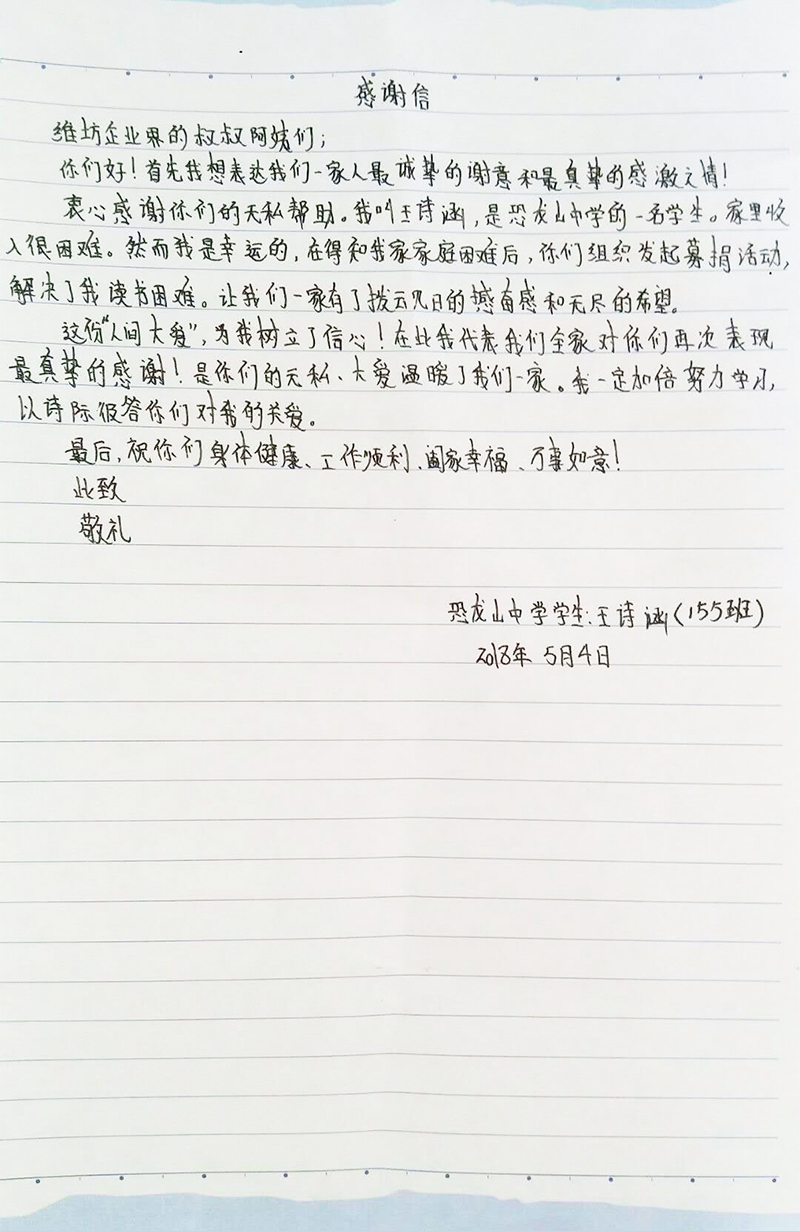 近日,潍坊东方企业家俱乐部收到了来自云南省禄丰县旧庄小学、恐龙山镇小学、恐龙山镇中学三个学校的学生发来的感谢信,专门感谢几千里之外的潍坊爱心企业及爱心人士。