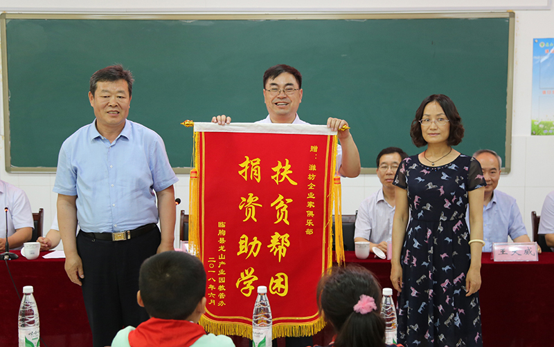 6月8日,潍坊市工商联、潍坊东方企业家俱乐部及社会各界爱心人士在临朐县龙山高新技术产业园龙岗小学举行捐资助学活动。
