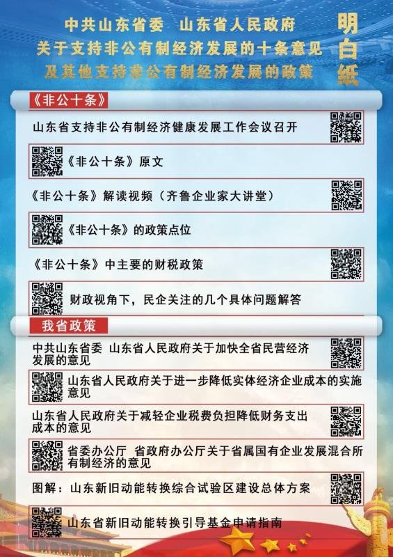 山东省有关支持非公经济健康发展的政策明白纸已下发,有需要了解有关政策的读者可扫码查看。