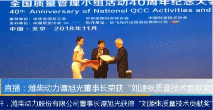 11月29日,在全国质量管理小组活动40周年纪念大会暨2018中国质量协会年会闭幕会上,2018年度中国质量协会质量技术奖获奖名单公布,潍柴动力董事长谭旭光荣获“刘源张质量技术贡献奖”,并在大会上作“潍柴高质量发展的实践之路”主题演讲。中国质量协会会长贾福兴向谭旭光颁发奖杯。这是潍柴继荣获第三届中国质量奖后,在质量领域获得的又一项重要荣誉。