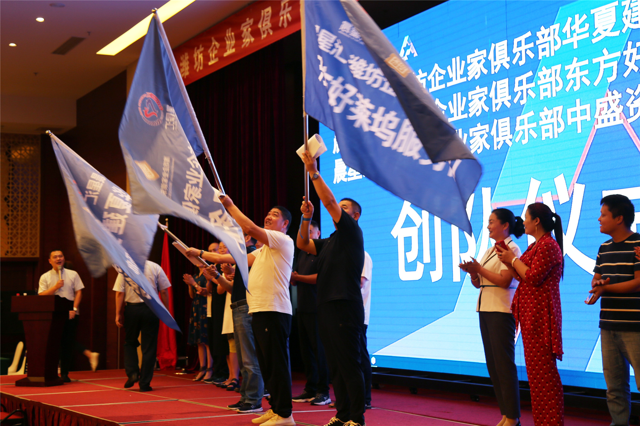 为促进公益模式有效落地,落实乡村振兴计划,会上举行了庄严的乡村振兴创队仪式。经潍坊市委统战部、潍坊市财政局、潍坊市住建局推荐,由潍坊东方企业家俱乐部常务会长单位潍坊东方好莱坞国际娱乐连锁机构董事长王超、潍坊中盛资本民间管理有限公司董事长张光文、潍坊市华夏建安有限公司总经理刘春海共同认领了乡村振兴服务队大队长,分别成立了晨星汇潍坊东方企业家俱乐部东方好莱坞服务队、晨星汇潍坊东方企业家俱乐部中盛资本服务队、晨星汇潍坊东方企业家俱乐部华夏建安服务队。