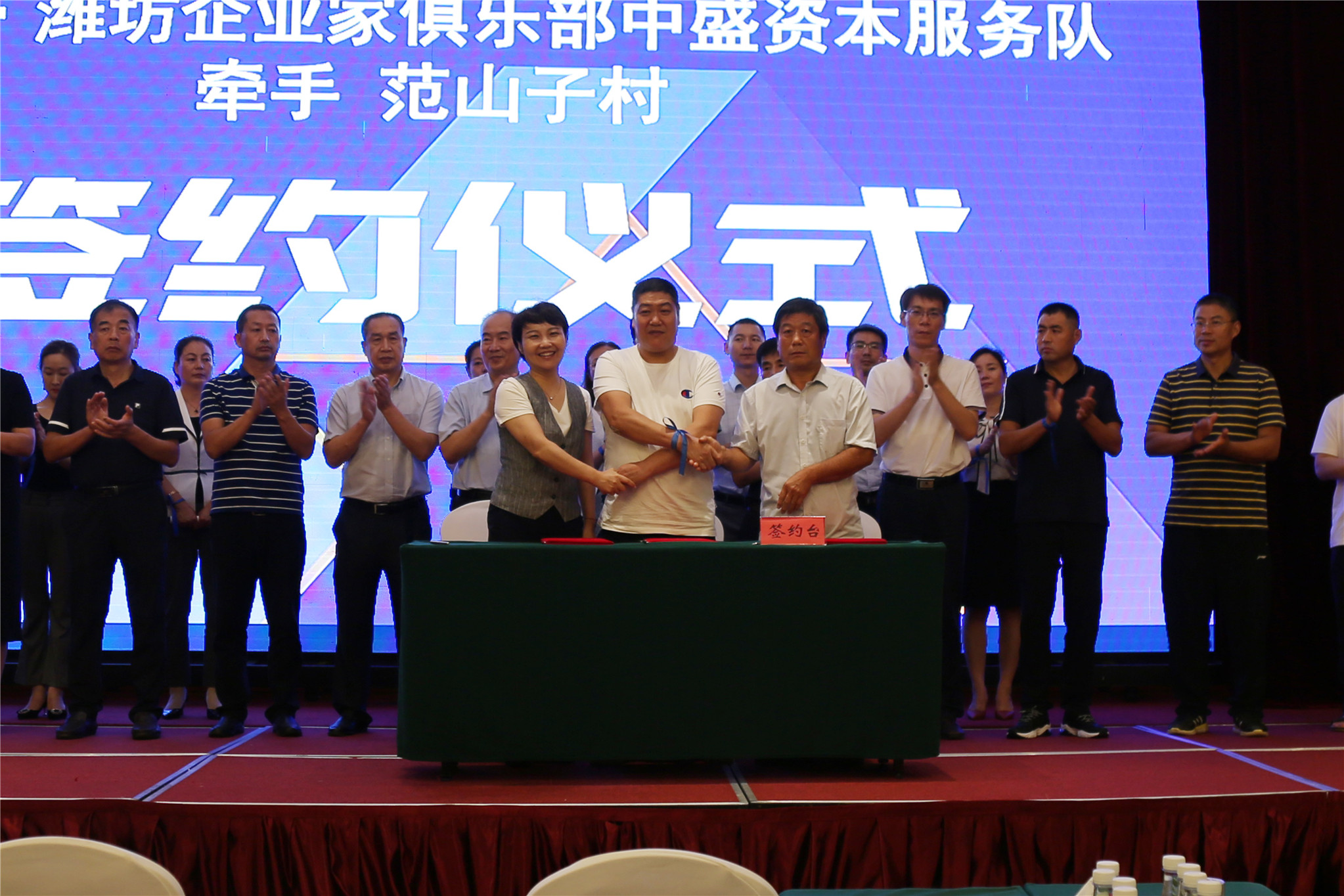 (晨星汇时燕老师与潍坊市政协委员、潍坊东方企业家俱乐部常务会长、东方好莱坞娱乐连锁机构董事长王超和夏庄村村支部书记丘丽娜女士签约)