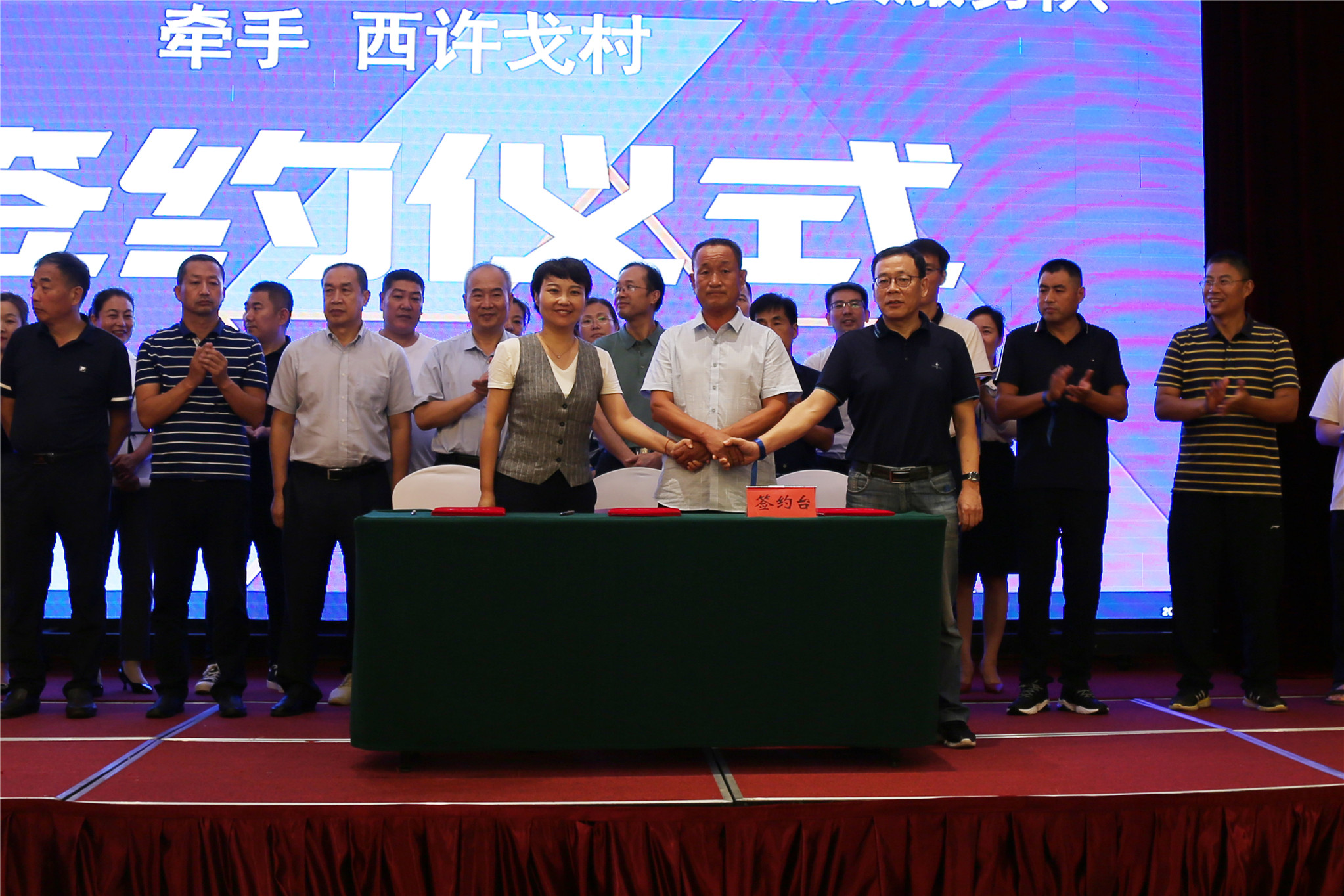 (晨星汇时燕老师与潍坊东方企业家俱乐部副会长、潍坊市华夏建安有限公司总经理,刘春海(代)和西许戈村村党支部副书记马志海签约)