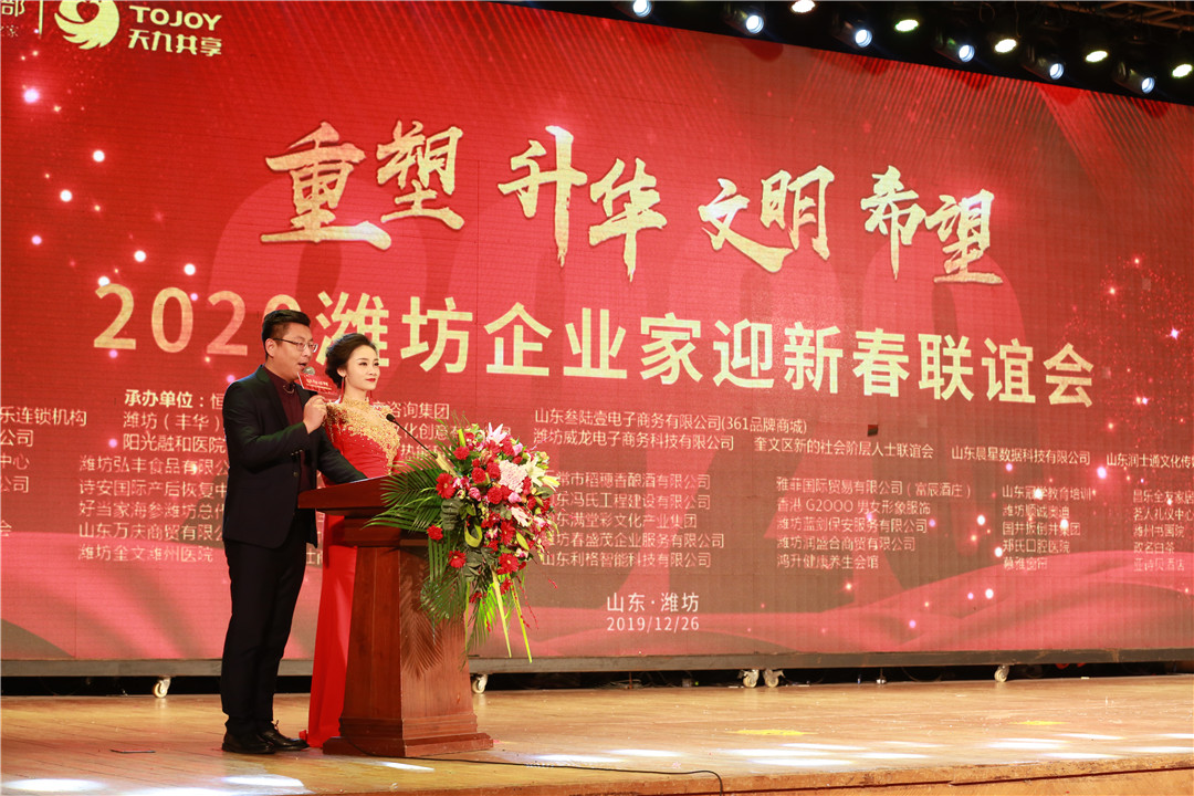 12月26日,由潍坊东方企业家俱乐部主办,恒信集团、天九共享咨询集团、山东叁陆壹电子商务有限公司承办,东方好莱坞国际娱乐连锁机构、潍坊丰华(集团)公司、山东永博文化创意有限公司、奎文区新的社会阶层人士联谊会、阳光融和医院、潍坊欧梦西热能科技有限公司、潍坊威龙电子商务科技有限公司、山东晨星数据科技有限公司、山东润士通文化传媒有限公司、山东飞米影视有限公司 等单位协办的“重塑 升华 文明 希望”2020潍坊企业家迎新春联谊会在富华成功举办。关心支持潍坊东方企业家俱乐部发展的政府各职能部门领导,潍坊东方企业家俱乐部顾问领导、潍坊东方企业家俱乐部理事会领导、会员代表、赞助商、企业界、媒体界朋友,各战略合作商会及兄弟友好商会的领导代表等五百余人欢聚一堂,共迎佳节。