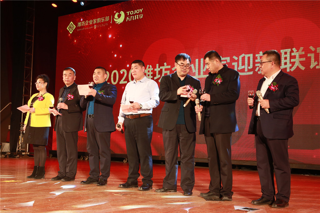 潍坊东方企业家俱乐部常务会长王超、程亚利、李玲、张光文、刘金富、孙建文、韩绍毅代表潍坊东方企业家俱乐部领导班子向大家致祝酒词,祝福大家在新的一年里一帆风顺、发展长青。