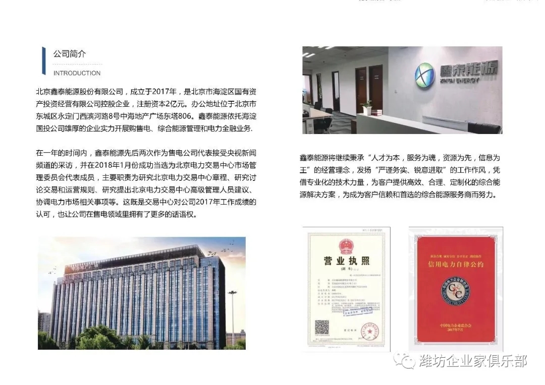 北京鑫泰能源股份有限公司,成立于2017年,是北京市海淀区国有资产投资经营有限公司控股企业,注册资本2亿元。鑫泰能源依托海淀国投公司雄厚的企业实力开展售电,综合能源管理和电力金融业务。京津冀售电行业第一名。服务客户:国家会议中心,中国国贸,中国尊,鸟巢,京沪高铁,北京奔驰,可口可乐,伊利等知名企业。