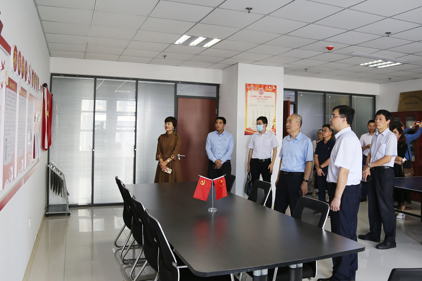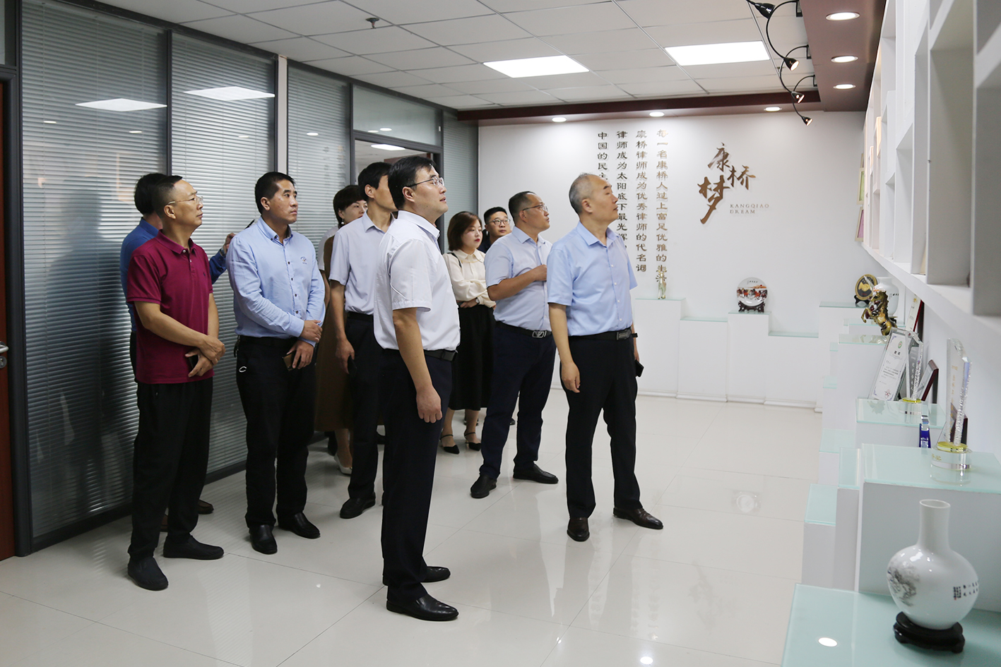山东康桥(潍坊)律师事务所支部书记合伙人张吉全对潍坊东方企业家俱乐部一行人的到来表示欢迎,并带领大家参观了山东康桥(潍坊)律师事务所办公环境。