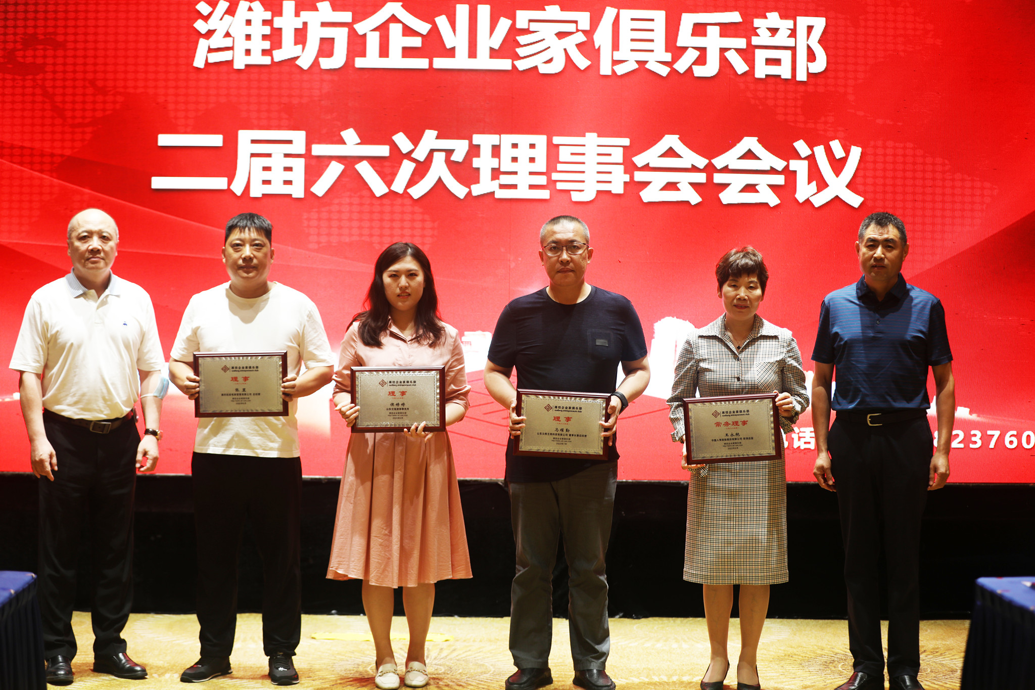 7月2日,潍坊东方企业家俱乐部二届六次理事会会议在新富佳悦大酒店召开。潍坊东方企业家俱乐部部分顾问团成员,荣誉会长张玉强,会长王大威,常务会长韩宝晶、王超、程亚利、李玲、刘金富、韩绍毅、陈丹、王洪玲、齐恩亮,监事长孙建文以及潍坊东方企业家俱乐部各副监事长、副会长、常务理事、理事等80余人参会。