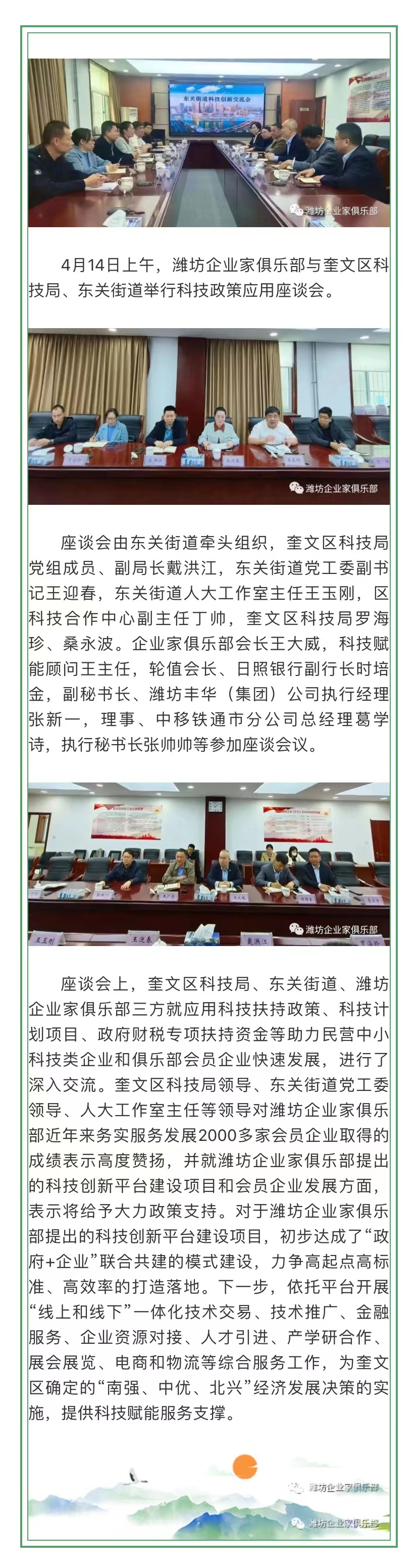 潍坊东方企业家俱乐部与奎文区科技局、东关街道举行科技政策应用座谈会