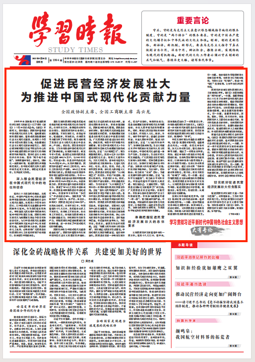 党的二十大报告明确指出,从现在起,中国共产党的中心任务就是团结带领全国各族人民全面建成社会主义现代化强国、实现第二个百年奋斗目标,以中国式现代化全面推进中华民族伟大复兴。作为我们党长期执政、带领全国人民实现中华民族伟大复兴中国梦的重要力量,民营经济的发展壮大与高质量发展这个首要任务息息相关、与以中国式现代化全面推进中华民族伟大复兴这个中心任务紧紧相连。宏伟蓝图催人奋进,民企使命无上光荣,必将激励广大民营企业和民营经济人士在党的领导下砥砺前行,在新征程中再建新功。