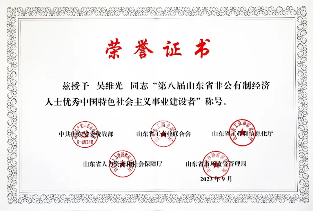 9月14日上午,第八届山东省非公有制经济人士优秀中国特色社会主义事业建设者表彰大会在济南召开。由我县工商联推荐的华建铝业集团董事长吴维光被授予“山东省非公有制经济人士优秀中国特色社会主义事业建设者”荣誉称号,并接受山东省委书记林武,省委副书记、省长周乃翔的会见。