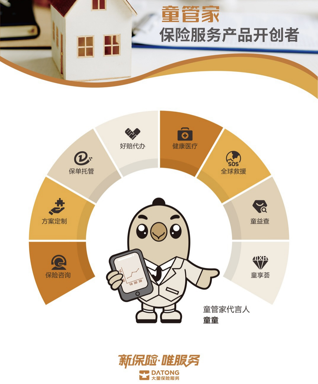 大童的保险服务产品“童管家”,整合各子公司优质资源,为客户提供专业的保险配套服务,让保险真正“好买、好赔、好用”。内容包括保险咨询、方案定制、保单托管、好赔代办、健康医疗、全球救援、童益查、童享荟等服务项目,并为企业提供常年保险顾问、专业咨询服务。同时我们专注中高端人士人身风险和财富风险规划管理,为企业、中产家庭、高净值客户提供团财保险、子女充裕教育金、高品质尊严养老、全球高端医疗、家企资产隔离、财富保全和传承规划中的资产配置等服务。