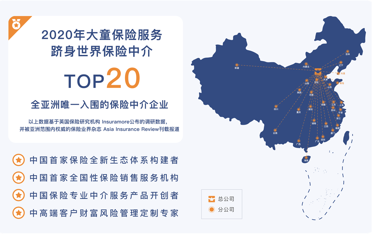 大童保险服务成立于2008年8月1日,总部设于北京,是中国保险中介领域,提供专业化保险服务的领军企业。大童的业务范围覆盖中国大陆地区20余个省份和直辖市,服务网点覆盖全国近200个城市,整合超过百余家产寿险公司的数千款产品,是中国最大的专业第三方保险服务机构之一。