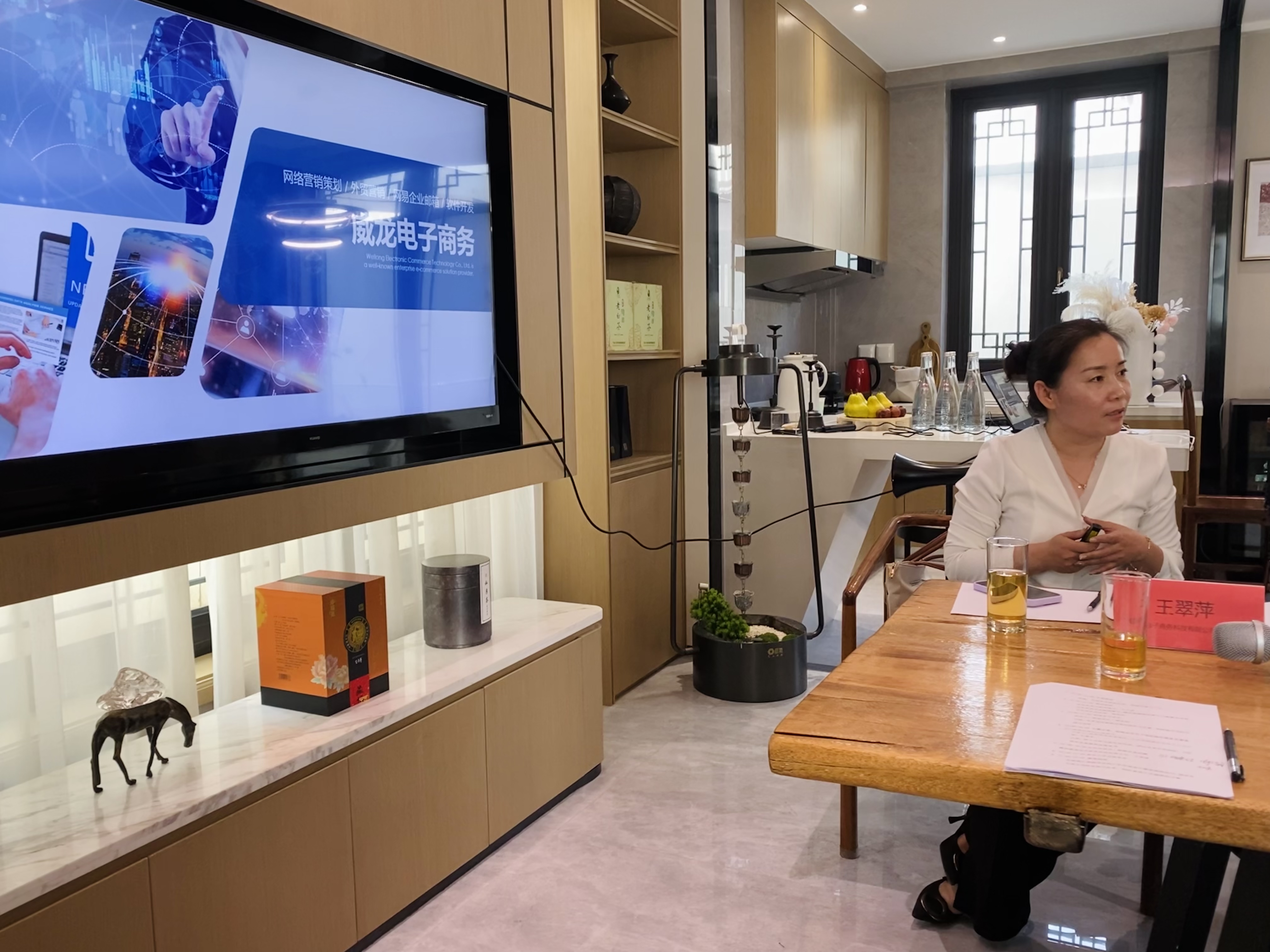 潍坊东方企业家俱乐部副理事长、潍坊蓝城桃李奔月小镇置业有限公司项目总经理周瑞玲对于各位企业家的到来表示热烈欢迎,她向大家介绍绿城·江南赋项目的特点与优势并欢迎大家经常来做客,她说作为潍坊东方企业家俱乐部的会员活动中心很开心大家能来此一起讨论外贸相关的问题与经验,希望大家今天能聊的愉快、谈的开心,成为彼此赋能的好伙伴。